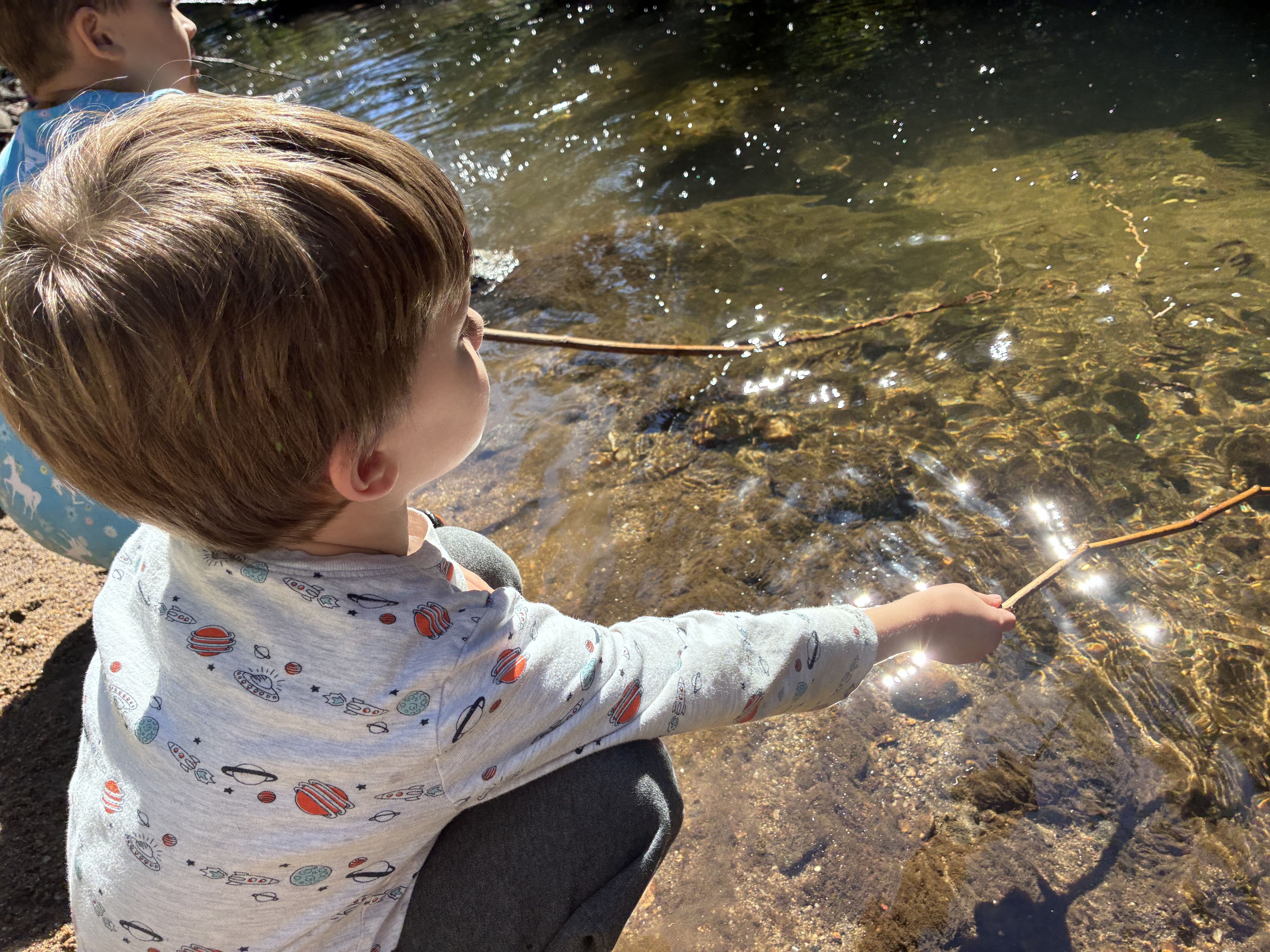 In Explorations, kindergarteners are given the time, space, and permission to explore our local ecosystem and gain valuable skills through play. Students learn to manage risks in a natural environment as they rock hop at the stream, learn cooperative skills and physics as they build forts, and practice negotiation skills as they develop new economic systems with acorns.